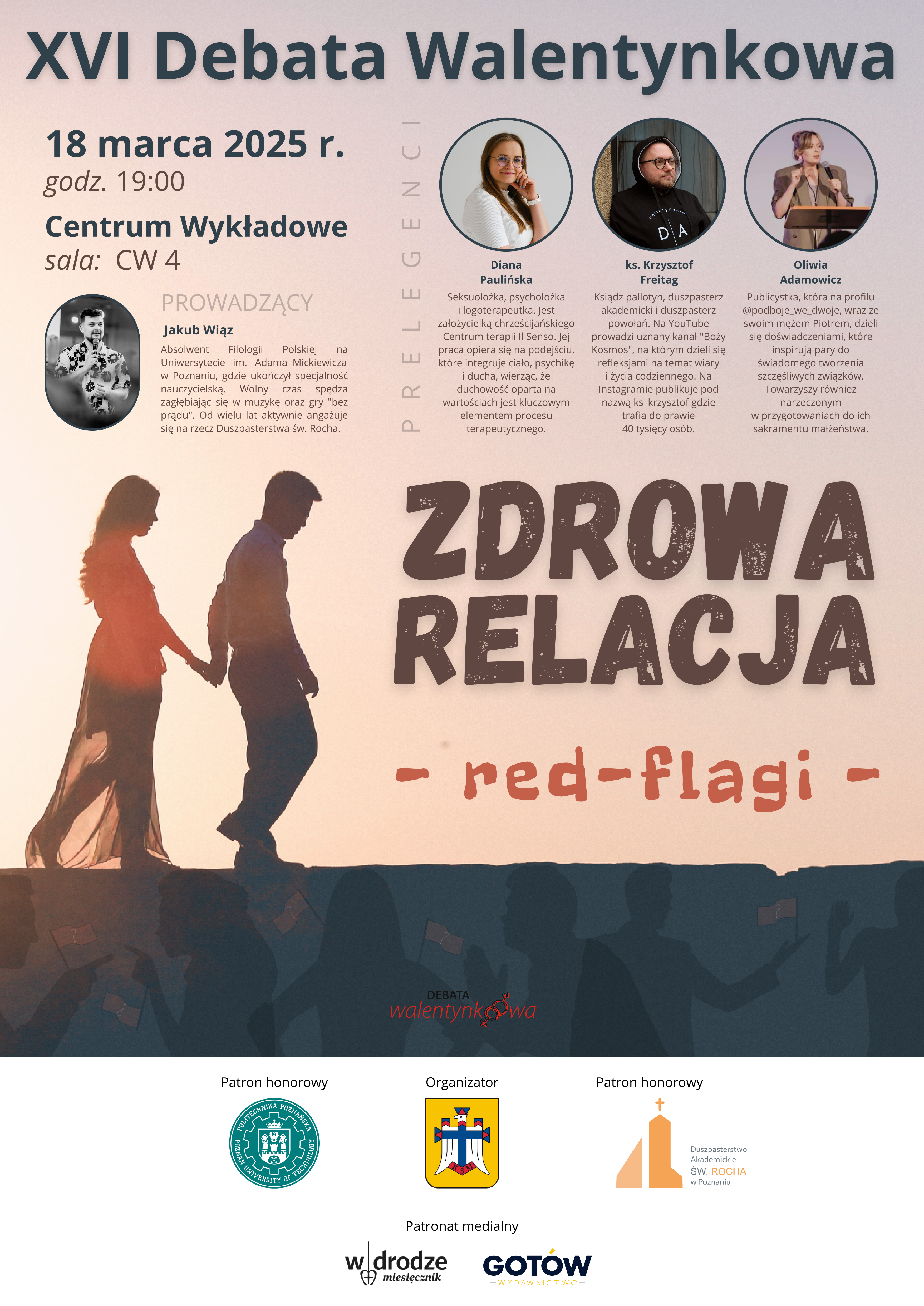 Debata "Między miłością a zdrowiem psychicznym" to dyskusja poświęcona wzajemnym relacjom między dobrostanem psychicznym a budowaniem bliskich więzi. Nasi goście porozmawiają o tym, jak dbać o własne granice w związku oraz jak wspierać partnera w trudnych chwilach, nie zapominając o autoterapii i własnym zdrowiu. Podczas debaty poruszone zostaną także tematy dojrzałej komunikacji, radzenia sobie z lękiem przed odrzuceniem oraz roli, jaką kondycja psychiczna odgrywa w tworzeniu trwałych i satysfakcjonujących relacji.
